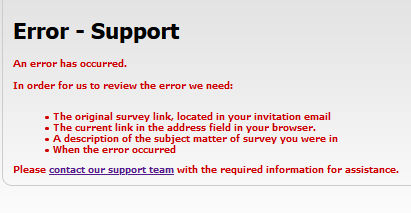 Note: If you didn’t receive an original survey invitation link, include the respondent GUID information that was shown on the error page you received. If you don’t have the respondent GUID information, provide the approximate date and time (including time zone) of the survey, along with additional details as described above.